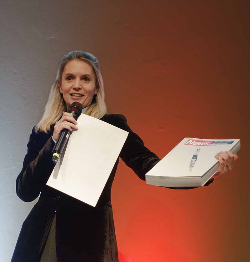 PR manažerka centra DOX Karolina Kočí s katalogem výstavy HIT BY NEWS, foto© Petr Šálek