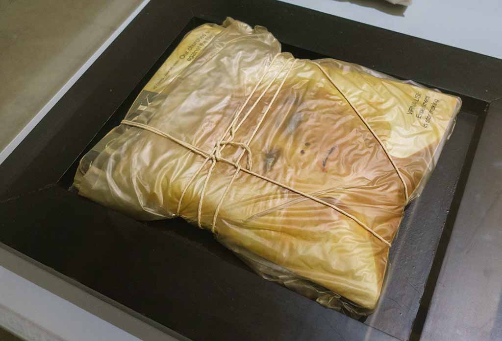 Výstava HIT BY NEWS v Centru DOX, Christo – Balík novin The New York Times – 13. června 1985, foto© Petr Šálek