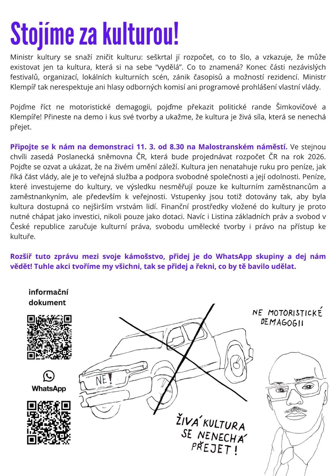 Na středu 11. března 2026 od 8.30 hod. na Malostranském náměstí svolává iniciativa studujících uměleckých vysokých škol demonstraci na protest proti seškrtávání rozpočtu na kulturu.