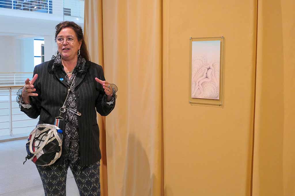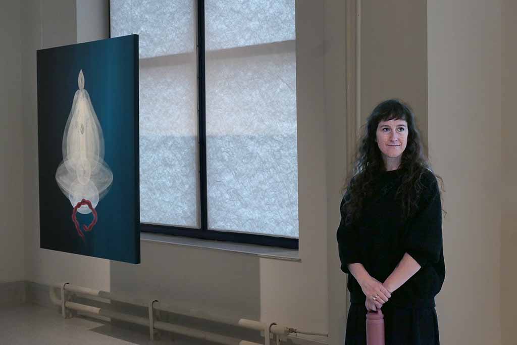 Instalace holandské výtvarnice Kinke Kooi: Naslouchající tělo je průřezová a přináší výběr prací od 90. let do současnosti. Její jemné kresby jsou umístěny na volném látkovém pozadí, které symbolizuje nutnost podpory a vzájemné závislosti. Dojem útulnosti a domáckosti navozuje pomocí drobných dekorativních předmětů na poličkách. Tím, že kombinuje vysokou výtvarnou techniku s využitím dekorativních prvků upozorňuje na polarizační moment vysokého umění a nižší rukodělné tvorby. Její pohled je velmi ženský a všeobjímající. „Na západě je kladen důraz na to, jak působíme navenek, ale to nejdůležitější se odehrává dovnitř, jak pečujeme o svůj vnitřní svět a jaké vazby s ním máme, to je mé hlavní sdělení“, řekla Kinke Kooi během prohlídky své výstavy.
