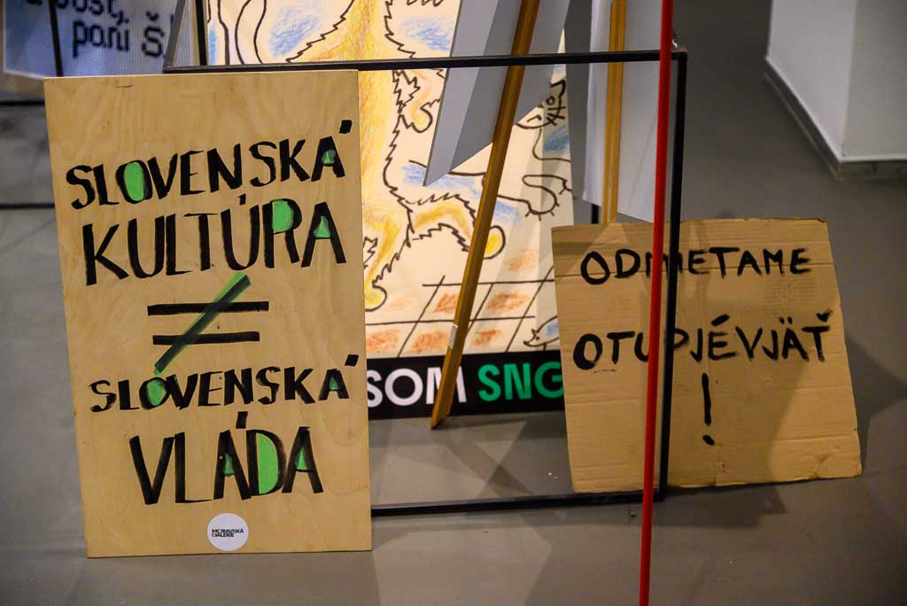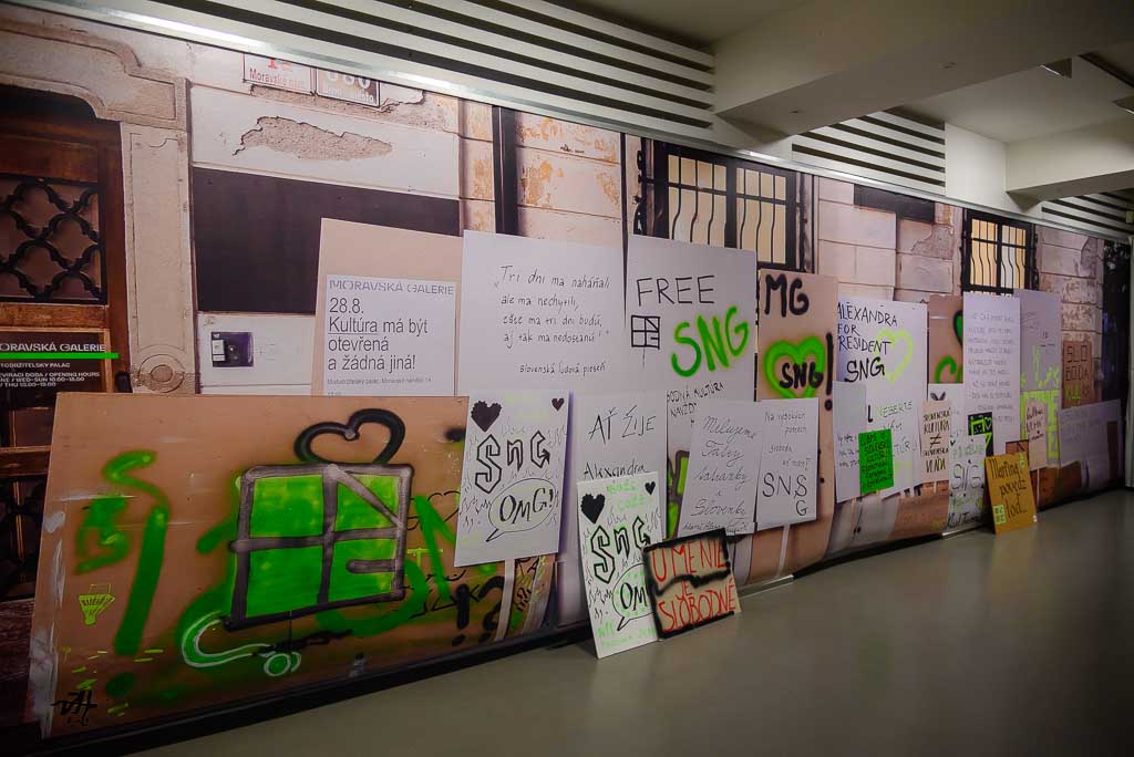 Po časové ose dosavadního vývoje v úvodu expozice následuje množství originálních písemnosti, fotografií i videozáznamů. Dokumentují skutečný průběh nastalé situace a následné spontánní aktivity na podporu galerie. Mezi nimi například vznik iniciativy „Neberte nám kultúru“ nebo „Umenie nebude ticho“, vyzývající k bojkotu reorganizované SNG. Výstava je koncipována velmi neformálně a se záměrně aktivistickým nádechem. Využívá již dříve použité panely nebo autentické transparenty a anonymní vzkazy z plotu galerie v rámci akce „Zanechte nám vzkaz“. Své vzkazy mohou zanechat i návštěvníci pražské výstavy. Je pro ně rezervován prostor na železném plotě, který na výstavě nahrazuje plot na nádvoří SNG.